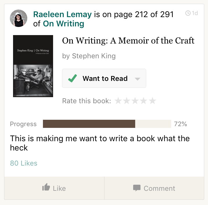 Goodreads is an excellent way to have a reading community. For a few months in 2017, it was my only form of social media. You can see what your friends are reading and their ratings and reviews. Friends can recommend books to each other within the website/app and like/comment on status updates.