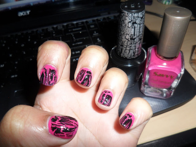 And finally, the nails of the moment that I just did tonight… OPI Black Shatter over some cheap Savvy brand pink nail color I’ve had forever.